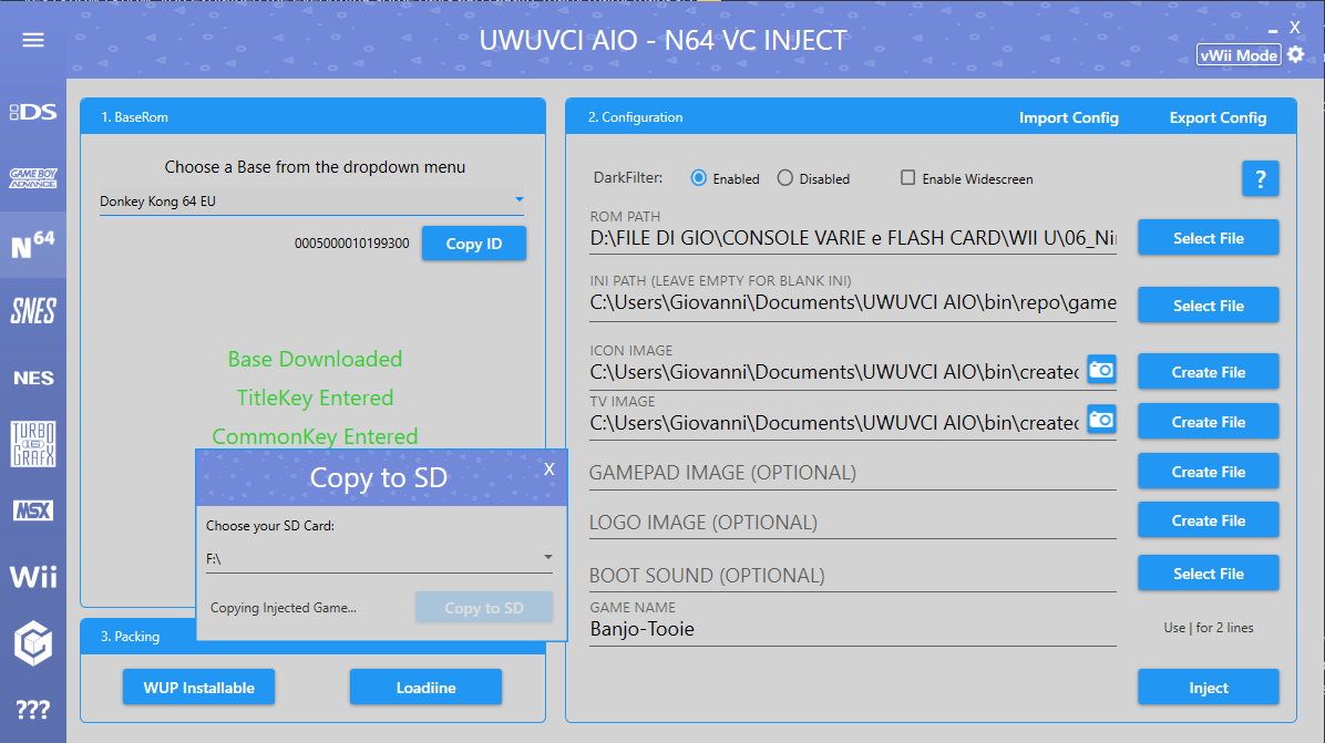 I'm always using the same base, Donkey Kong 64 EU. But in the last step, when i choose WUP Installable, if i choose COPY TO SD and i select the SD card, nothing happens..it still continue to open the pop up but nothing happens